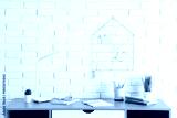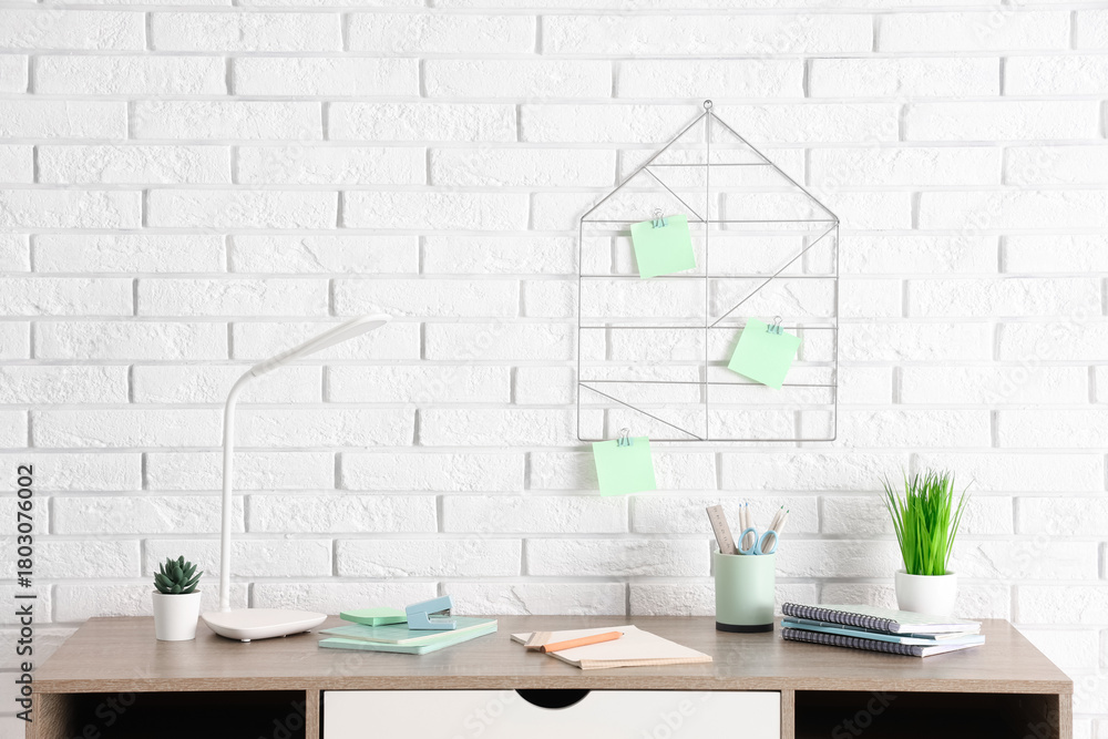 Modern workplace with desk lamp, houseplants and office supplies near white brick wall