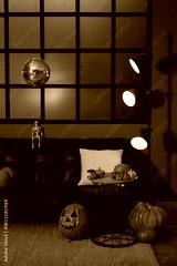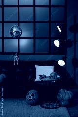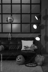 Beautiful living room with disco ball, glowing lamps and black sofa decorated for Halloween party at night