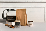 Paper bag with beans, coffee pot and glass of hot espresso on grey table