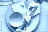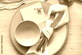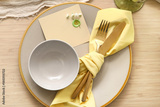 Spring table setting with golden cutlery, top view