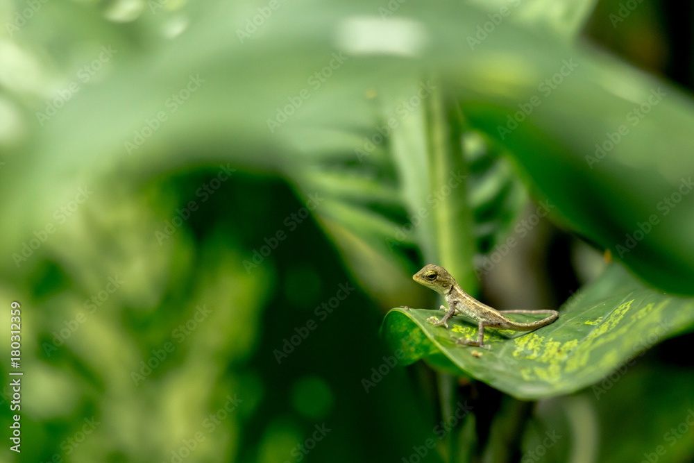 Closeup chameleon brown color on top of plant in the green forest of heaven, green leaf in the front look like the eye looking on the chameleon and forest. Environment friendly concept, safe world.