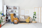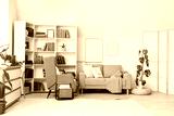 Interior of stylish living room with brown armchair, grey sofa and bookshelf