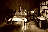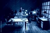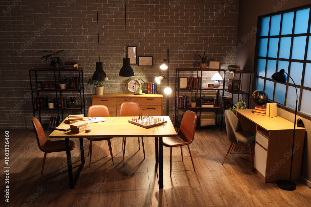 Interior of dark room with bookshelves, tables and glowing lamps at night