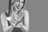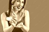 Beautiful middle-aged woman with candy cane on red background, closeup. Christmas celebration