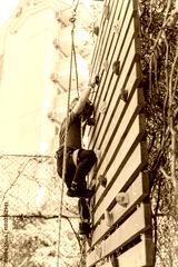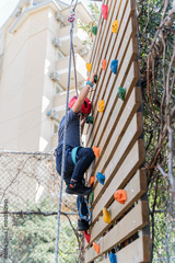 Child boy Rock Climbing on Outdoor Wooden Wall
