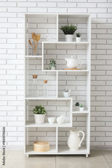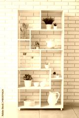 Shelf unit with kitchen utensils and artificial plants near white brick wall