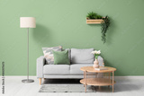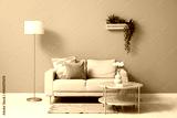 Interior of living room with sofa, table and artificial plants