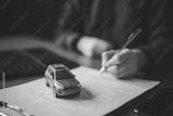 car, loan, purchase, insurance, finance, A small model car placed on a contract while a person signs documents, representing car loans, insurance policies, vehicle financing, and ownership agreements.