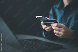 A person making an online payment using a smartphone and credit card, representing ecommerce transactions, digital payments, mobile banking, and secure financial operations.