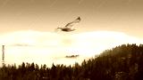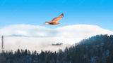Red-tailed Hawk flying over the blue mountains with sunset sky