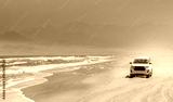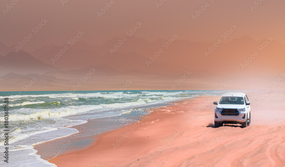 A SUV moving on the pink sands of Skeleton Beach - Namib desert, Namibia