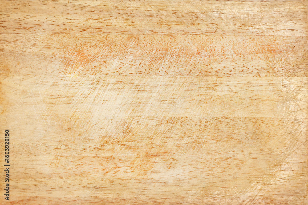 Close-up of worn antique cutting board with knife cut marks texture background