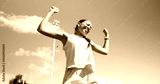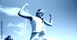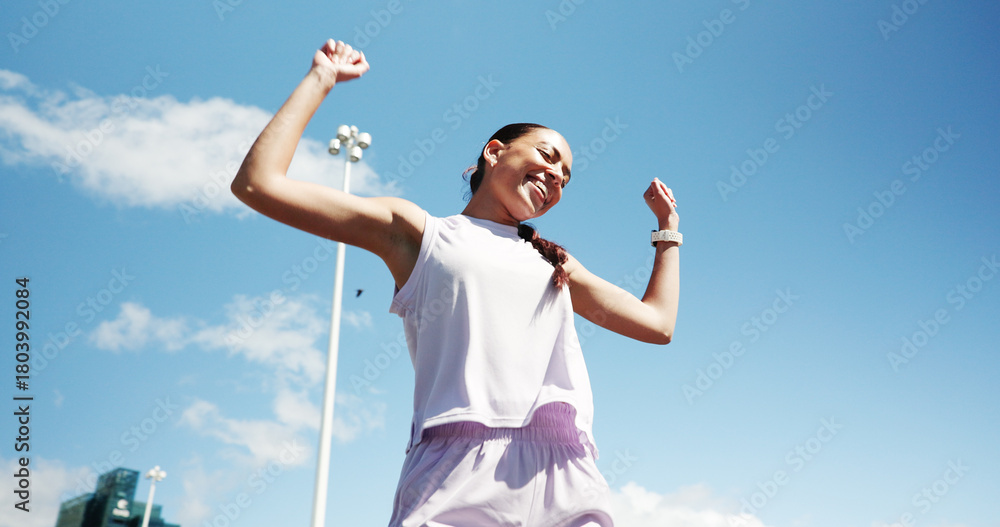 Happy woman, runner and winning race in city for fitness challenge, marathon or competition. Active, female person or winner with smile or fist pump for sport, sprint or victory in an urban town