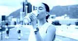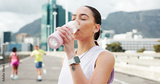 Woman, fitness and drinking with water bottle in city for workout break, rest or recovery. Active, female person or runner with mineral liquid, aqua or beverage for sports hydration in an urban town