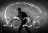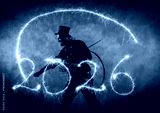 Schornsteinfeger in Arbeitskleidung schreibt mit Wunderkerzen, 2026. Symbolbild für das Neue Jahr.