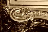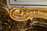 A close-up of gilded, highly carved ornamentation featuring scrolling curves
