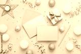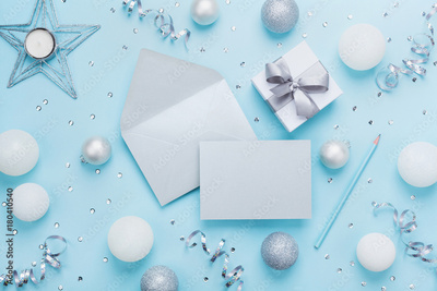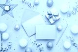 Fashion christmas mockup for greeting. Envelope, paper card, gift box and decoration on blue table top view. Flat lay style.