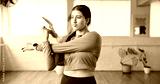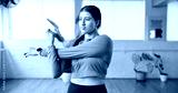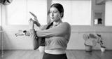 Exercise, woman and stretching arms in studio for wellness, health and start yoga routine. Person, yogi and warm up muscle at club for pilates preparation, flexibility and getting ready for fitness
