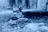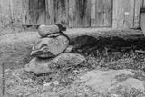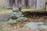Corner of a rustic Appalachian house on a stacked stone foundation pier, horizontal aspect