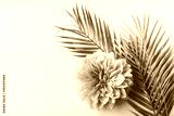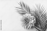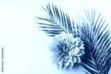 Pastel pink flower and tropical palm leaves on white desktop background, top view, creative layout with copy space, border