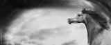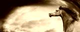 Thoroughbred arabian horse running at awesome dramatic sky background. Horse head with developing mane, banner or template