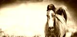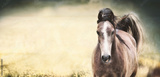Brown horse with a white stripe on the face at nature background, banner or template