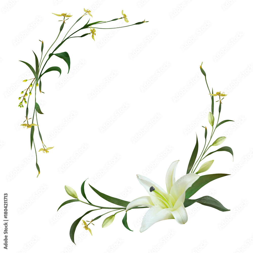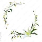 White Lily flower wreath or corner border arrangement delicate funeral or wedding invitation isolated on transparent background