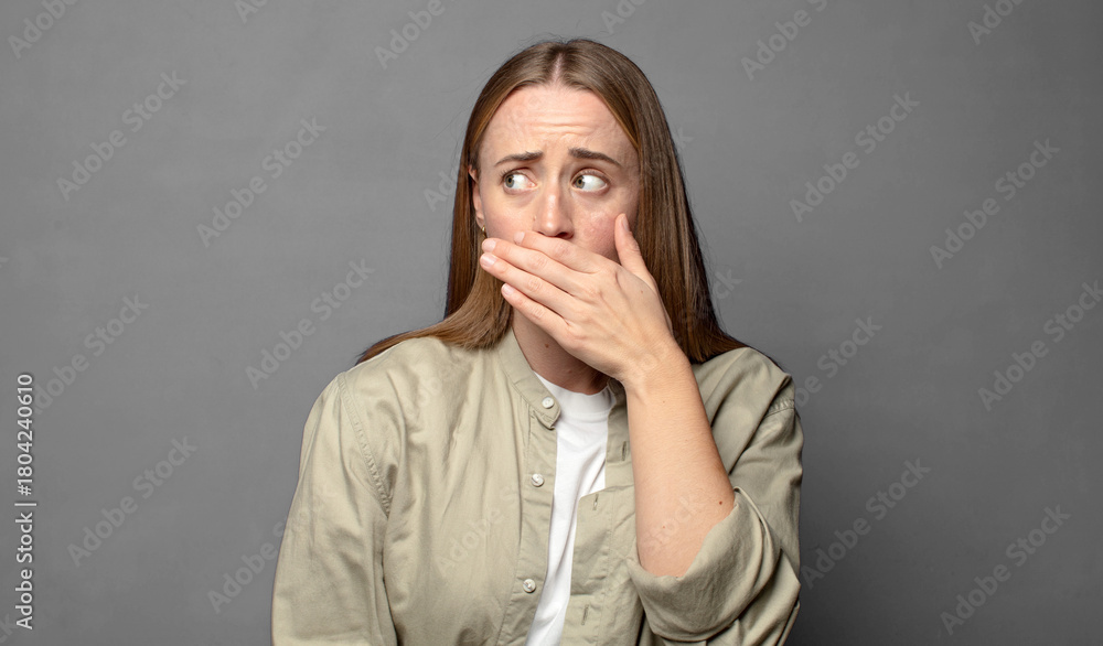 covering mouth with hands with a shocked, surprised expression, keeping a secret or saying oops