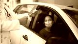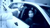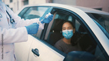 Healthcare, patient and hands with vaccine, car or injection for Covid prevention and communication. Drive tru, medical help and consultation for RSV immunization, medicine and woman in vehicle
