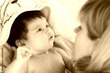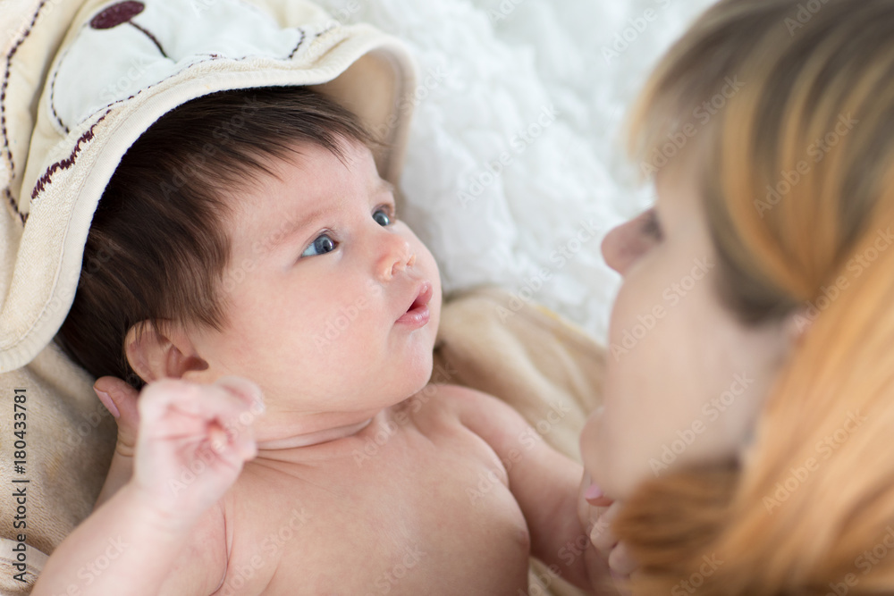 happy mother and baby infant looking each at other