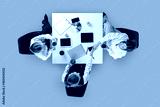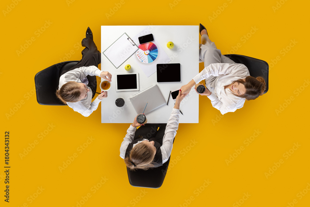 Team shaking hands and checking devices during work session. Concept of HR visuals, corporate communication, business workflow and social media content.