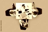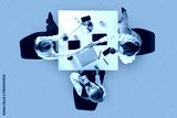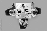 Business team discussing color chart and devices during coffee break in overhead angle. Concept of marketing content, office routines, education materials and corporate communication.