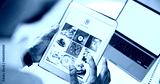 Tablet screen, food and ux with hands of person in office for social media, recipe marketing and homepage. Web design, online lunch menu and cooking blog and order app with man in agency for ui
