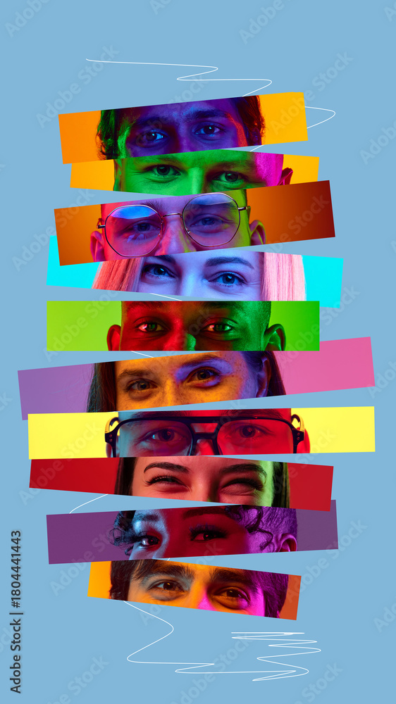Striped collage of expressive eyes in vivid colors. Concept of brand identity, diversity awareness, editorial content and communication materials for marketing teams. 9 models