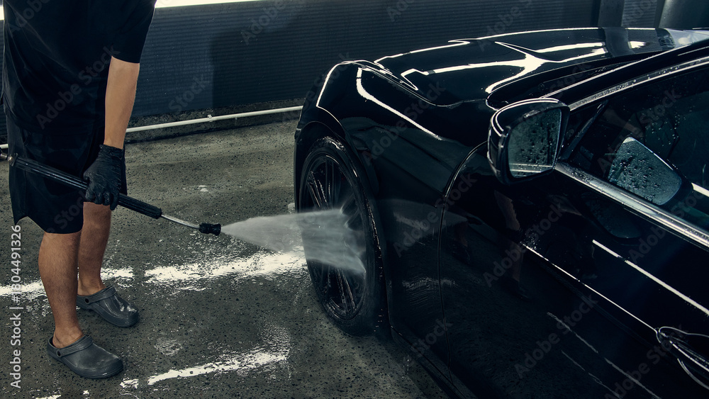 Worker rinsing car wheel with high pressure water during detailing process. Concept of precision workflow, car care advertising, and auto service visual representation.