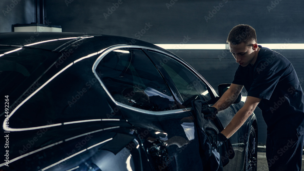 Worker wiping car door with microfiber towel during final detailing stage. Concept of automotive care, precision cleaning, service workflow, and maintenance professionalism.