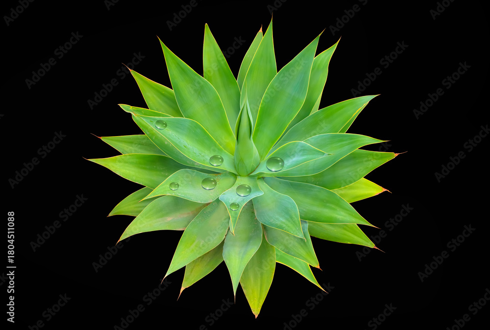 Water droplets accumulated on the leaves of a cactus - Agave cactus plant green tone color natural isolated white abstract pattern background - Agave attenuata, Fox Tail Agave Plant Isolated on black