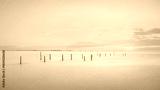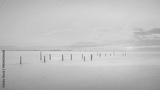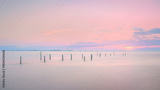 Vibrant sunset illuminates tranquil sea with leading lines of poles.