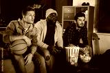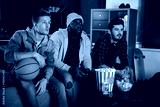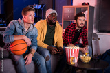So exciting. Three young interested guys are sitting on sofa and expressing exhilaration while watching sport game with opened mouthes. Friends are eating popcorn and drinking beer