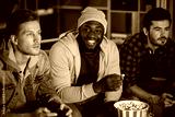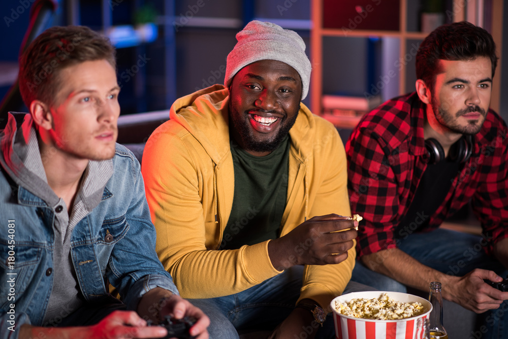 Rest with friends. Portrait of positive trendy african guy is sitting on couch and eating popcorn while looking at camera with smile. Two young concentrated men are playing video game. Selective focus