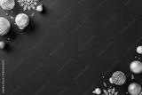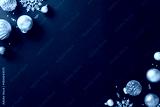Corner Christmas composition with shiny gold and green Xmas decorations on navy blue background. Flat lay, top view, copy space.