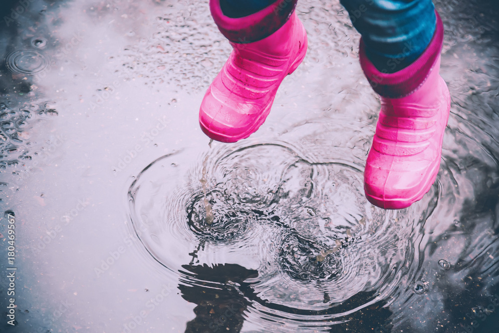 The girl in pink boots jumping in puddles after rain outdoors. Toned.