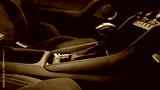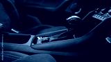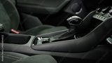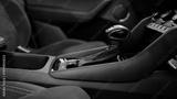 Modern car interior details featuring the dashboard, manual gear shift, and passenger seat with alcantara upholstery and white stitching