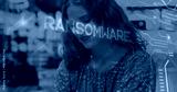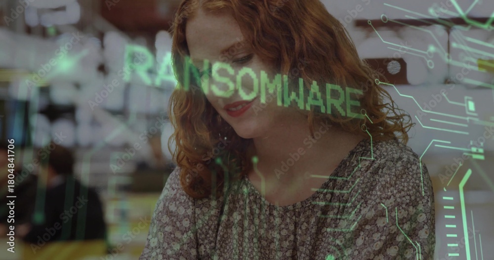 Sitting woman in patterned blouse typing at office desk with monitors, monitoring RANSOMWARE HUD