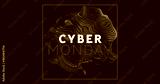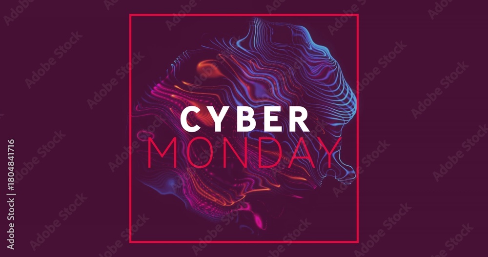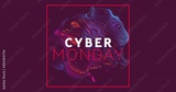 Centered graphic showing flowing wave on purple banner with neon-pink square frame and CYBER MONDAY