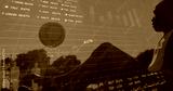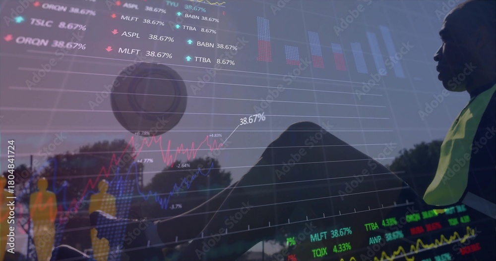 Standing field worker wearing reflective vest overlooking trees with market charts, copy space