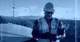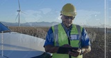 Holding tablet technician in yellow hardhat hivis vest monitoring at wind farm near white vehicle