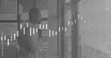 Adjusting tie, man in light shirt by office window showing candlestick with red trend, copy space