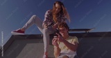 Perched couple scrolling phone at skate ramp, plaid, red sneakers, yellow tee, board, earbuds