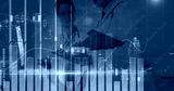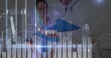 Analyzing two doctors in white coats reviewing data on blue tablet in clinic, with AR charts
